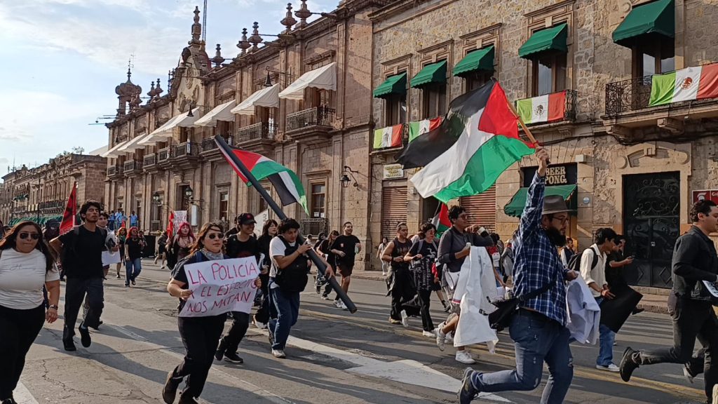 Integrantes de Casas del Estudiante de Morelia, de las ocho normales del estado y miembros de la Coordinadora de Universitarios en Lucha (CUL) arribaron al Centro Histórico para participar en la protesta. En esta ocasión, portaron banderas de Palestina, alusivas al conflicto bélico de aquella nación del Medio Oriente.