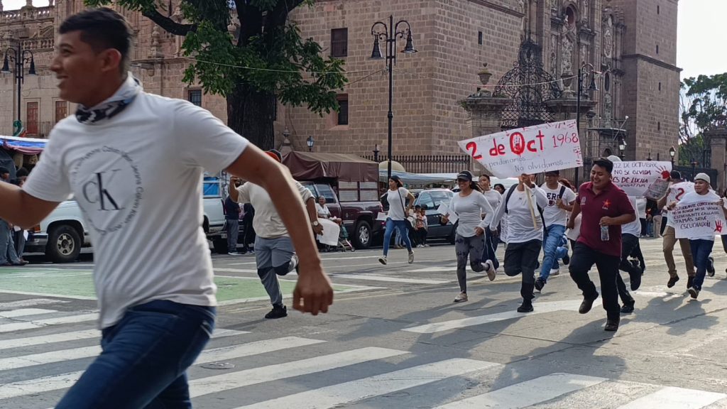 Morelia, Mich.- Este jueves, en conmemoración de los 57 años de la masacre de Tlatelolco, estudiantes de la Universidad Michoacana y de diversas instituciones realizaron una marcha en el Centro Histórico de Morelia para recordar a las víctimas y reafirmar que “el 2 de octubre no se olvida”.