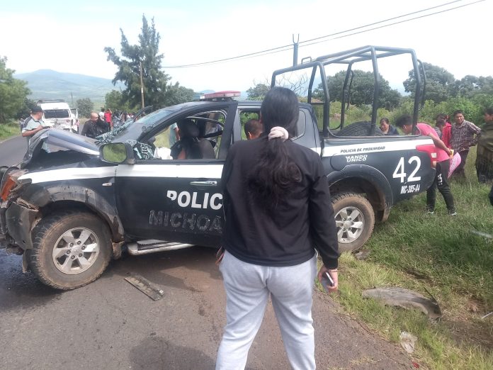 Tangancícuaro, Mich.- Un total de 20 lesionados entre ellos cuatro policías municipales, fue el saldo que dejó el choque por alcance entre una patrulla y una combi del servicio público. Los uniformados acudían a la comunidad de Guarachanillo a un enfrentamiento.
