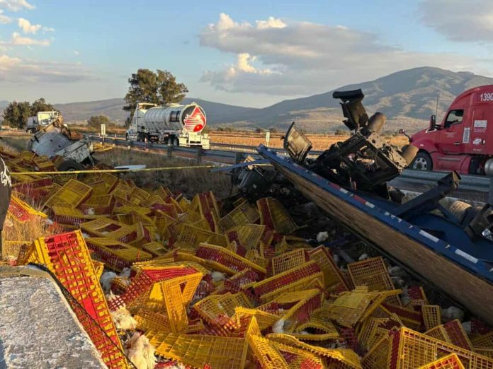 Ecuandureo, Mich.- Un tractocamión que transportaba pollos se accidentó sobre la autopista México-Guadalajara, a la altura del kilómetro 367, informaron autoridades policiales, las cuales agregaron que el chofer de la unidad perdió la vida.