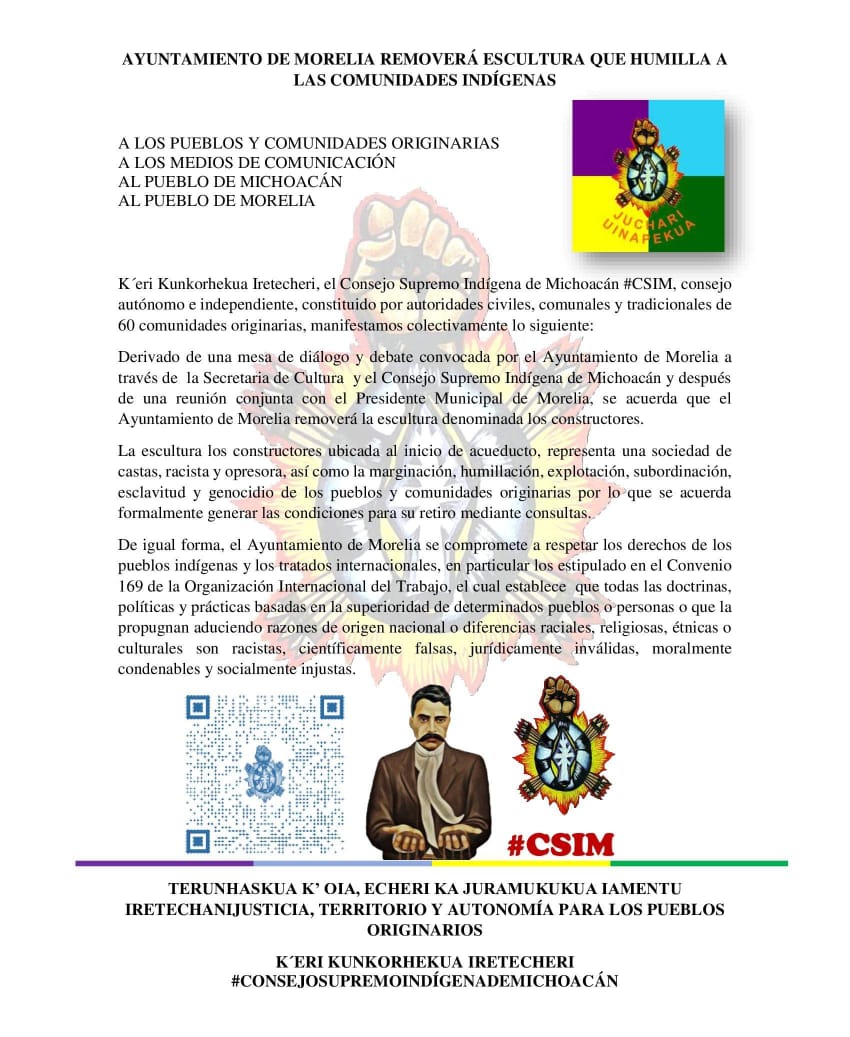 En un comunicado, el Consejo Supremo Indígena de Michoacán #CSIM, informó que tras sostener una mesa de diálogo “convocada por el Ayuntamiento de Morelia” y después de una reunión conjunta con el Presidente Raúl Morón Orozco, se acordó que removerá la escultura denominada los constructores.