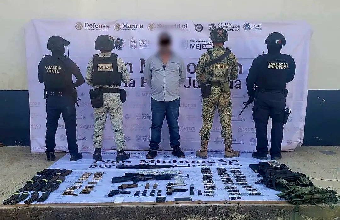 Tepalcatepec, Mich.- Como resultado de un despliegue interinstitucional en la región de Tierra Caliente, fuerzas estatales y federales detuvieron a Víctor Noé F. G., identificado como hermano de Juan José Farías, alias “El Abuelo Farías”, presunto líder del “Cártel de Tepalcatepec”. Al momento de su captura, le fueron aseguradas armas de alto poder, equipo táctico y dinero en efectivo.