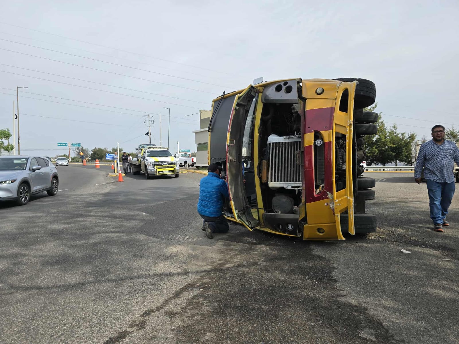 Camión Ruta Industrial vuelca tras chocar contra glorieta en Tres Marías; hay varios heridos