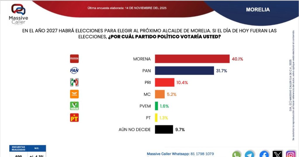 De cara a la elección del 2027, la empresa Massive Caller dio a conocer la última encuesta para conocer la intención del voto para la presidencia municipal de Morelia.