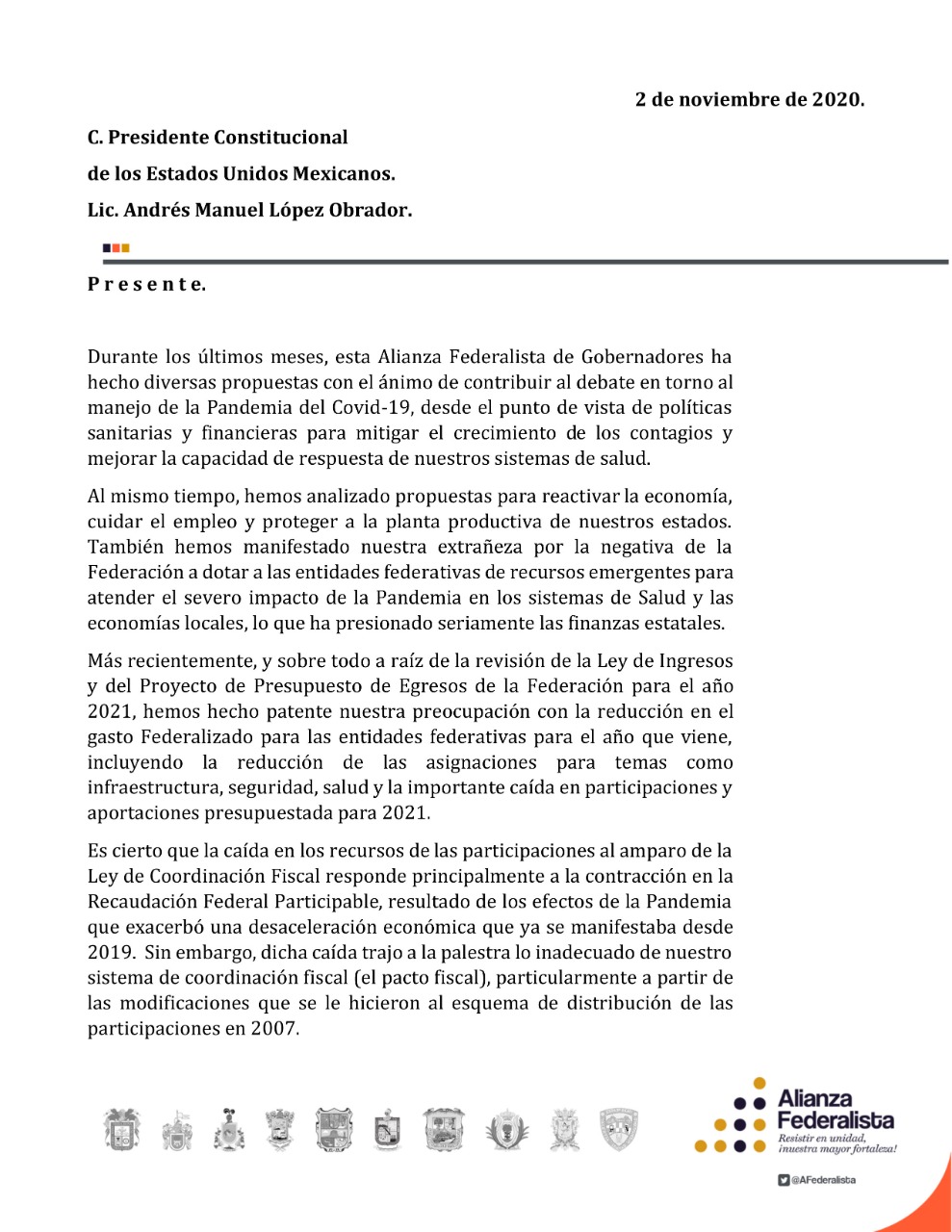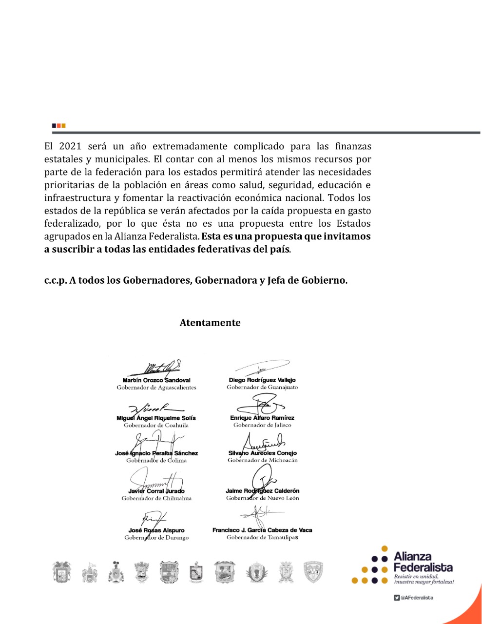 En una carta dirigida al Ejecutivo federal, señalaron que la posición de los 10 mandatarios es “que ningún estado del país puede recibir menos recursos en términos reales que en el año 2020”.