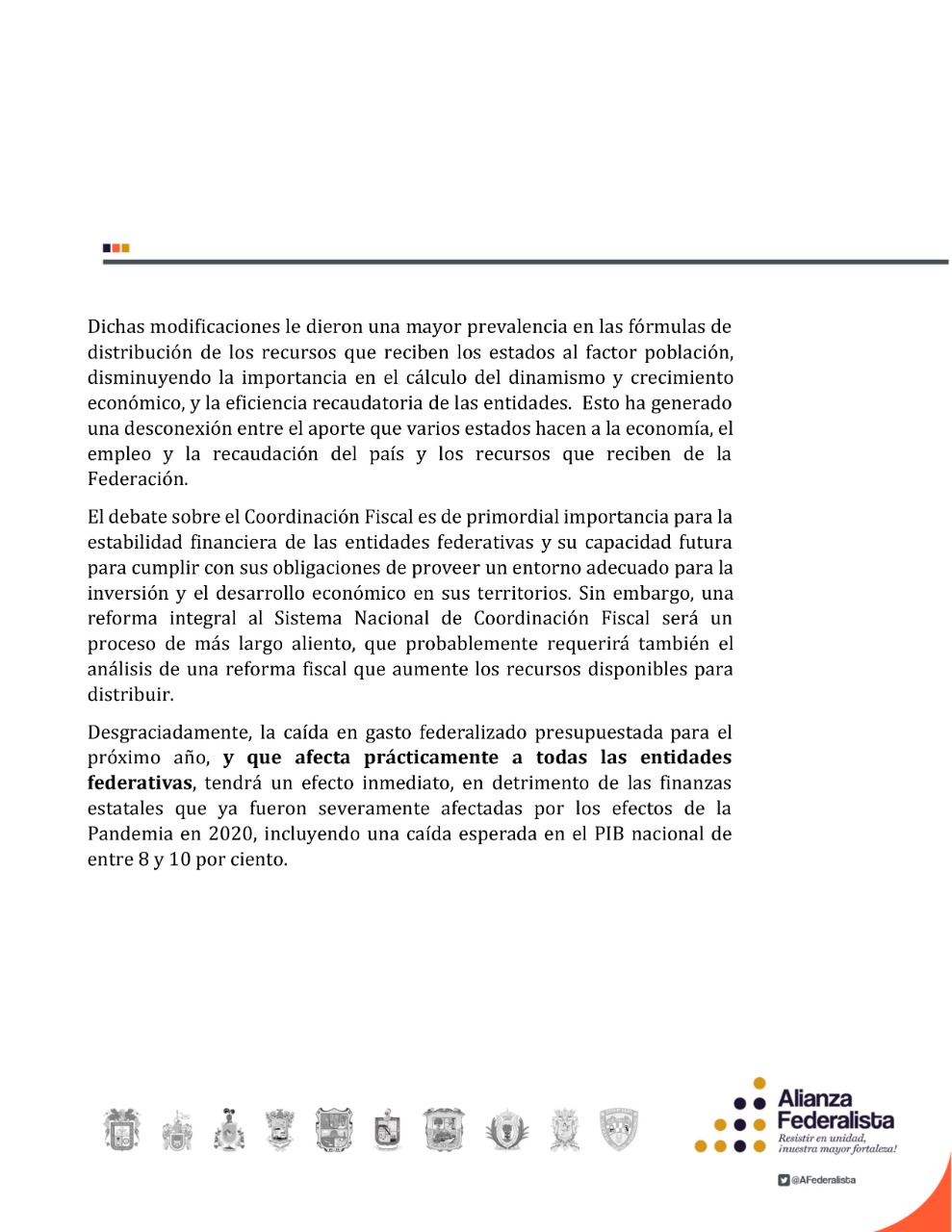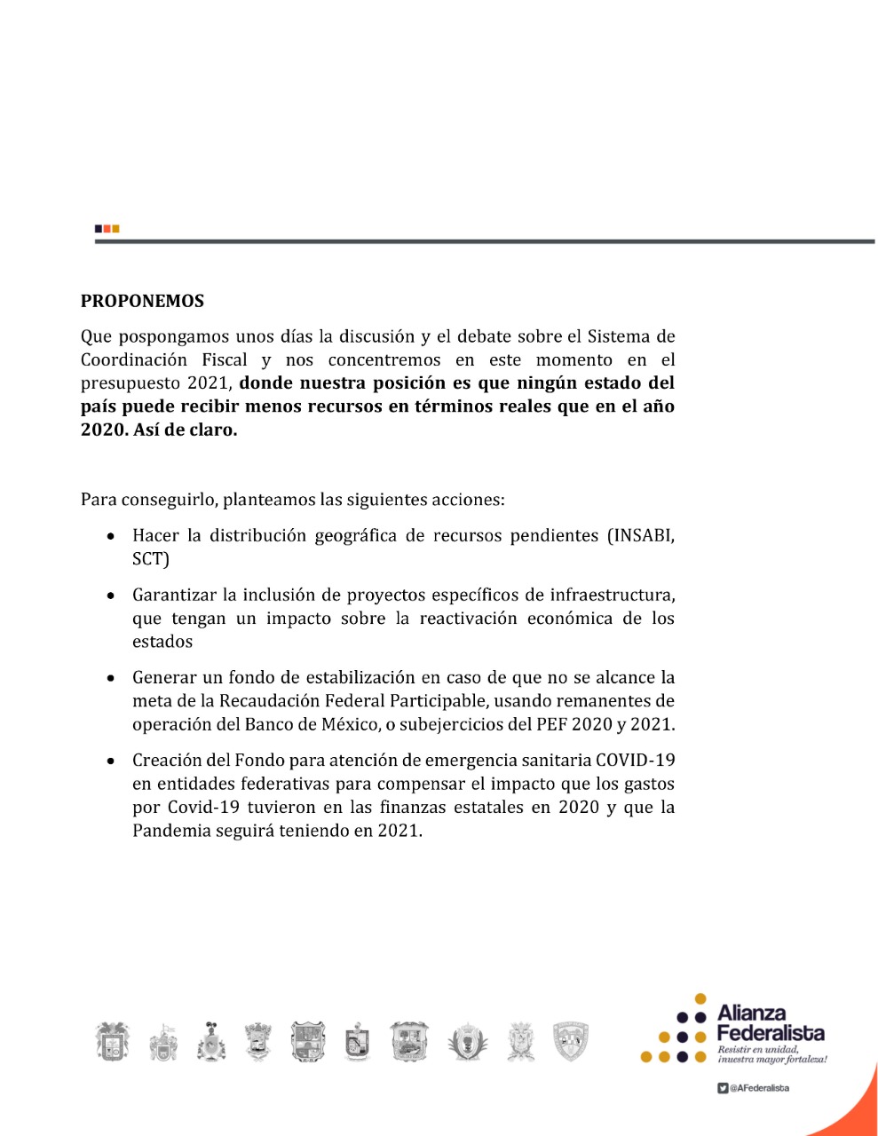 Tras exponer su preocupación con la reducción del gasto federalizado que se contempla en el proyecto de Presupuesto Federal para el 2021, en detrimento de todas las entidades federativas, propusieron las siguientes acciones:
