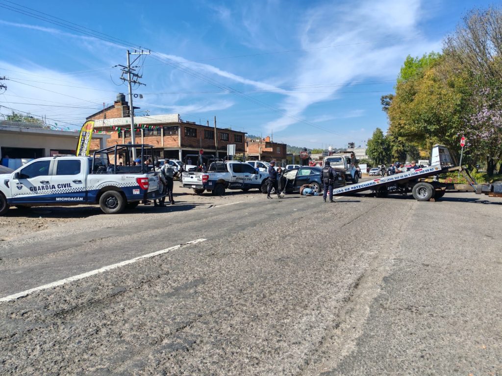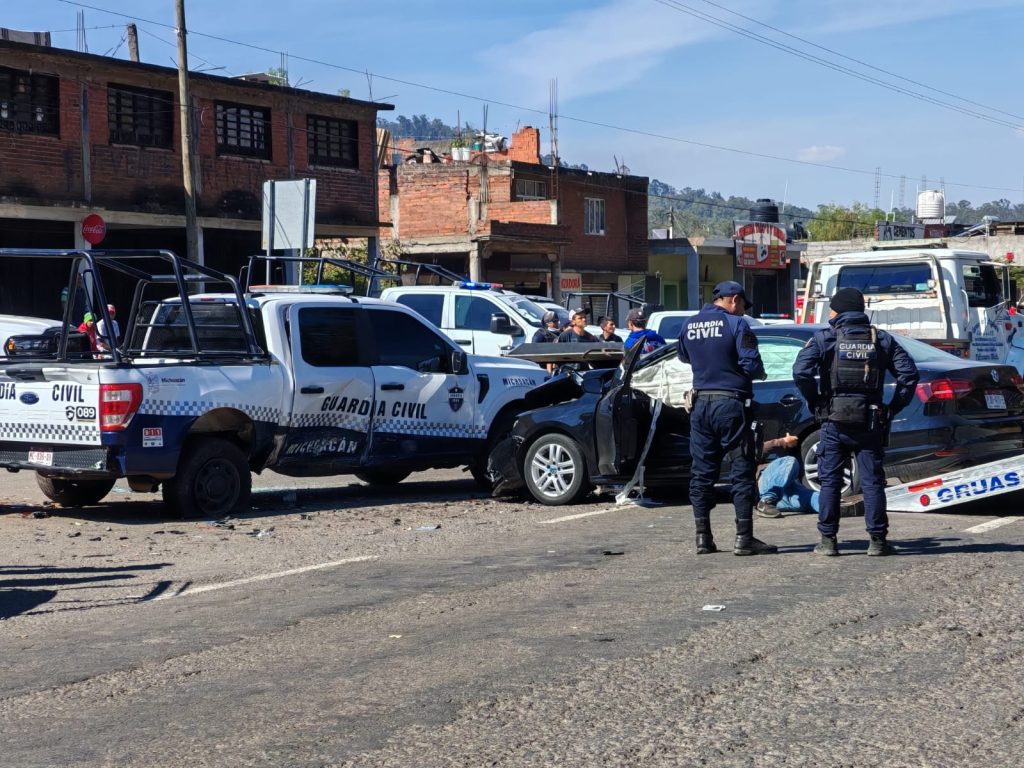 Pátzcuaro, Mich.- Tres vehículos, entre ellos una camioneta patrulla de la Guardia Civil (GC), protagonizaron un choque sobre la carretera Pátzcuaro-Quiroga, hecho que dejó al menos ocho personas heridas: cinco oficiales y tres civiles, de acuerdo con información preliminar.