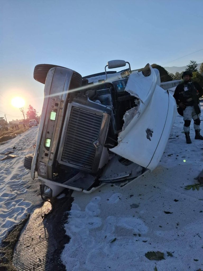 El tractocamión, de la marca International y color blanco, transportaba fertilizante; su conductor resultó ileso tras el incidente.