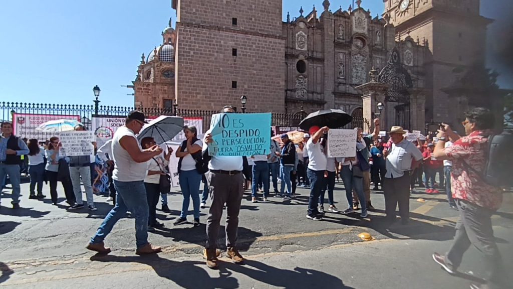 Morelia, Michoacán.– Integrantes de la Unión de Sindicatos y Organizaciones Sociales del Estado de Michoacán (USOSEM) se manifestaron este viernes en el Centro Histórico de la capital michoacana para denunciar despidos injustificados de docentes del CONALEP Michoacán, lo que provocó el cierre del primer cuadro de la ciudad.
