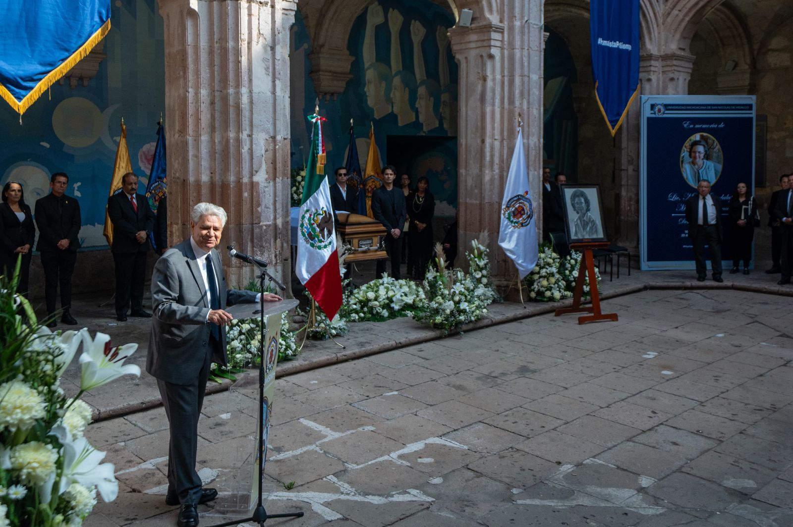 Durante el evento la rectora realizó la primera guardia de honor e hizo entrega de la Bandera Nicolaita a los familiares de la destacada abogada.