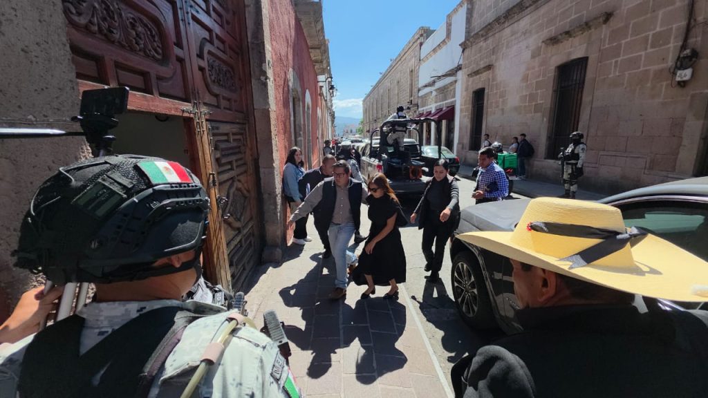 Una vez terminada la sesión extraordinaria del Congreso Local, Grecia Quiroz salió escoltada por el Ejército Mexicano y la Guardia Nacional por un edificio alterno que conecta con el recinto legislativo.