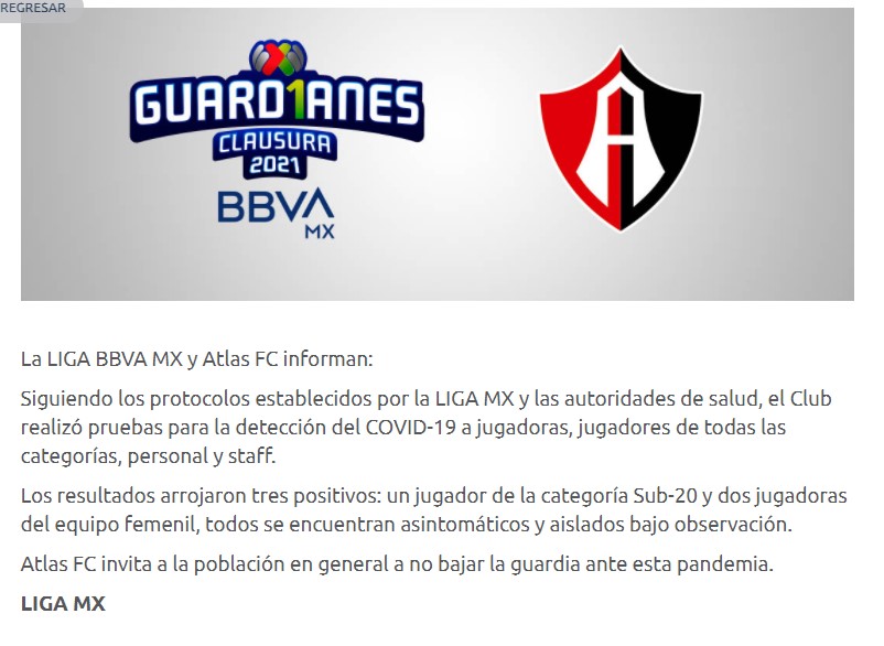 En lo que corresponde a las pruebas realizadas por el Atlas, la liga en conjunto con el club, informaron que tras las pruebas realizadas al primer equipo varonil y femenil, así como a la categoría sub-20, cuerpos técnicos y staff de estas categorías, los resultados arrojaron un total de 3 positivos, siendo un jugador de la categoría sub-20 y dos jugadoras del equipo femenil.