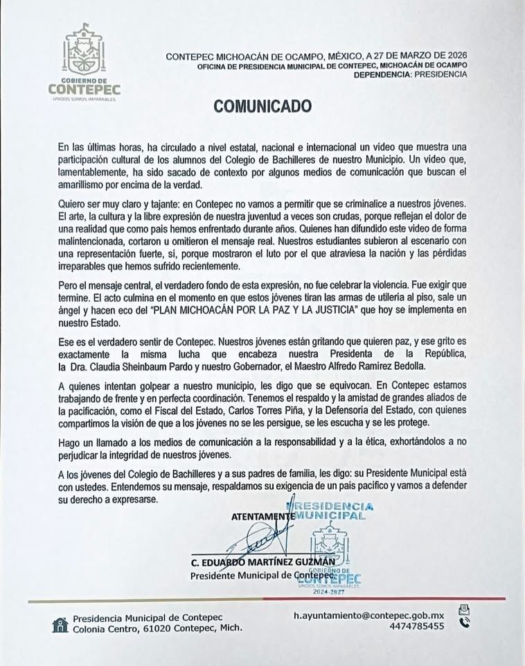 Tras anunciar el viernes anterior el cese fulminante del director y el maestro que organizaron el evento en el que estudiantes del Colegio de Bachilleres (COBAEM) de Contepec presentaron una coreografía vestidos con ropa táctica y armas de utilería, el gobernador Alfredo Ramírez Bedolla pidió no “criminalizar“ a los alumnos y aclaró que los responsables son quienes están a cargo del plantel y los docentes.
