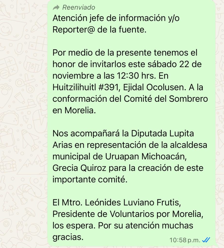 Explicó que su presencia en la ciudad fue para recibir la entrega de un reconocimiento póstumo al edil uruapense, Carlos Manzo Rodríguez aunque en la pared había una lona con la leyenda “Comité del Sombrero Morelia” y Leónides Luviano Frutis convocó a medios para presentar la creación de dicho Comité.