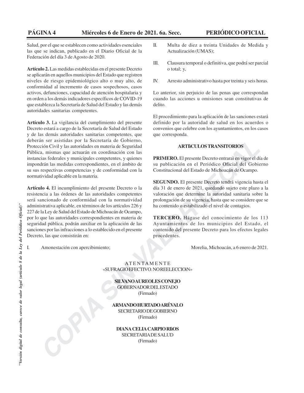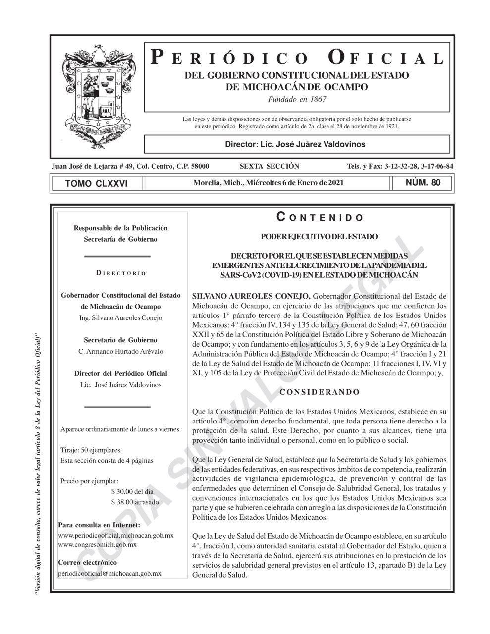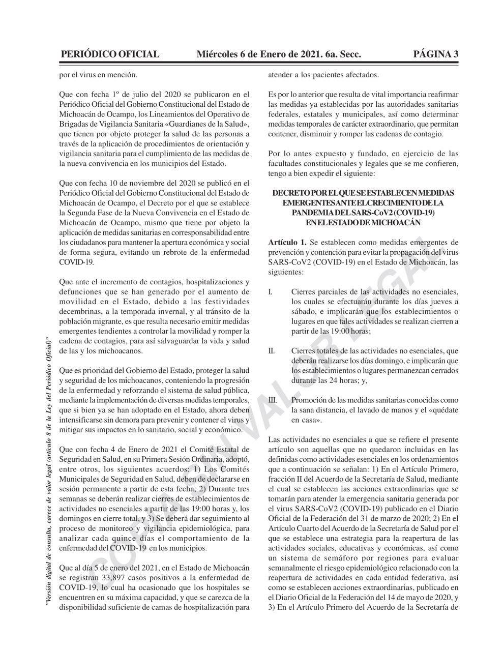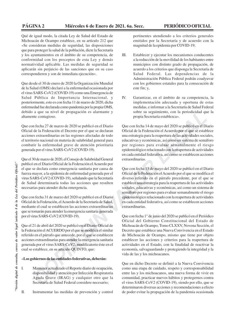 El decreto fue publicado en el periódico oficial del estado, por el gobernador Silvano Aureoles Conejo, quien argumentó la necesidad de tomar las medidas por “el incremento de contagios, hospitalizaciones y defunciones que se han generado por el aumento de movilidad en el estado, debido a las festividades decembrinas, la temporada invernal y el tránsito de la población migrante”.