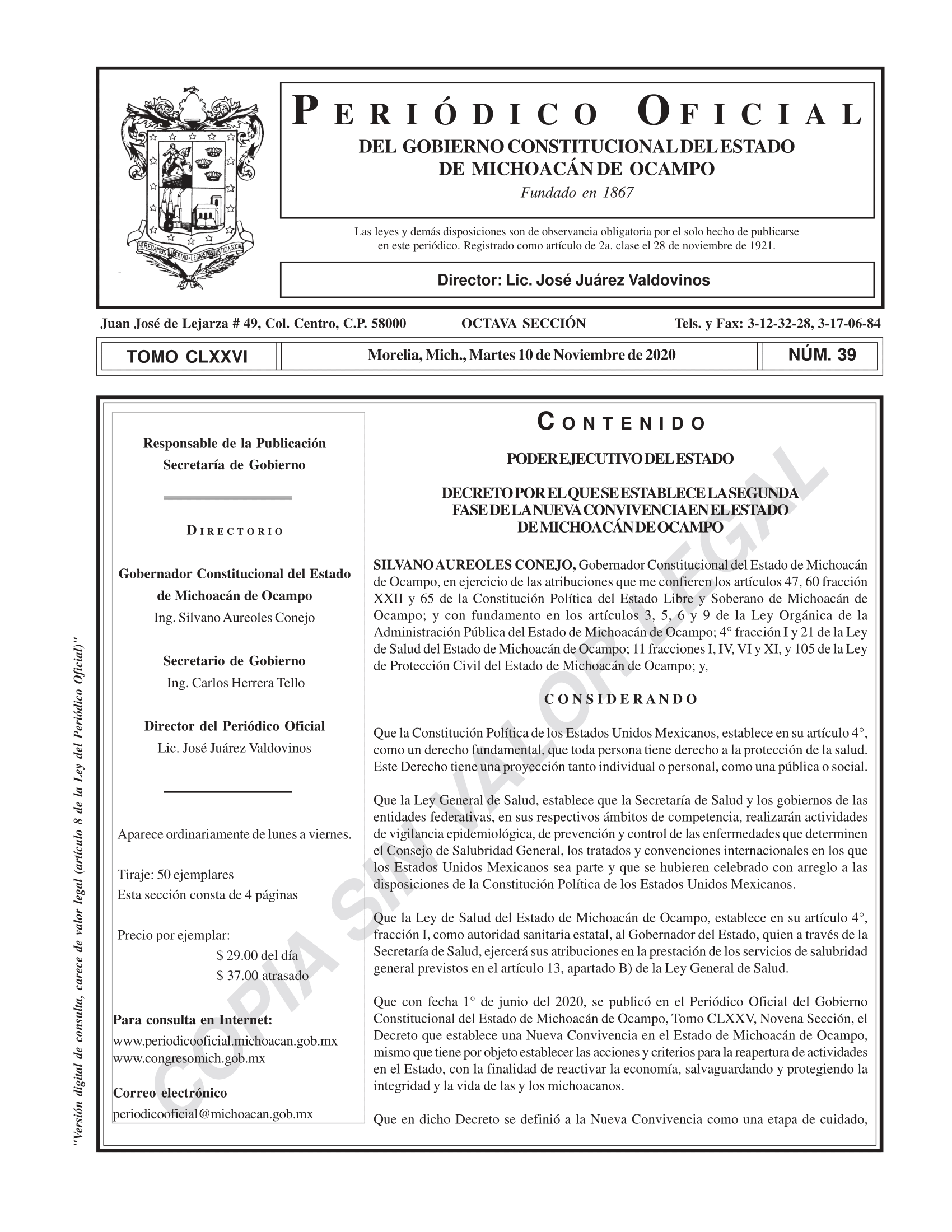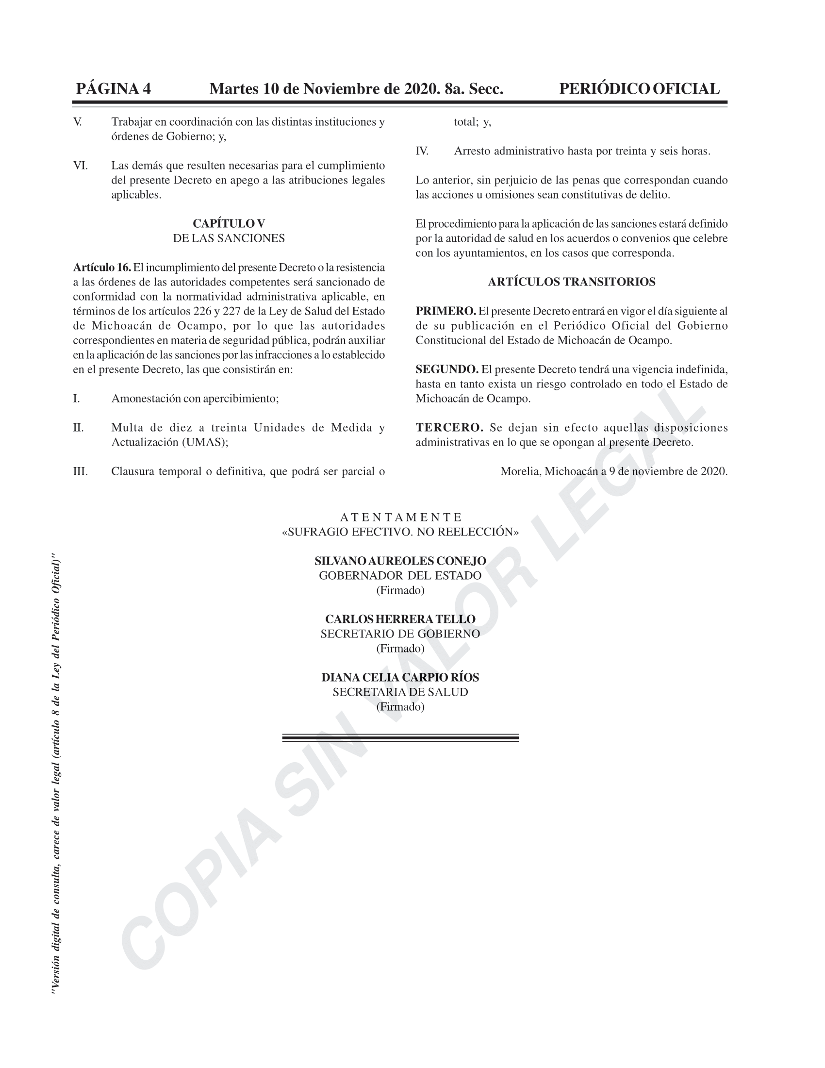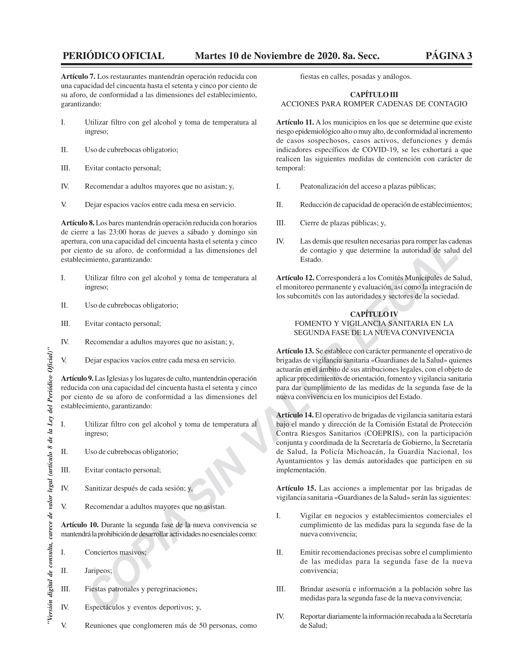 El decreto emitido por el gobernador Silvano Aureoles Conejo y que entró en vigor este 11 de noviembre, establece como premisa principal la aplicación de las medidas sanitarias en corresponsabilidad con los ciudadanos, para mantener la apertura económica y social, sin riesgo de rebrote.