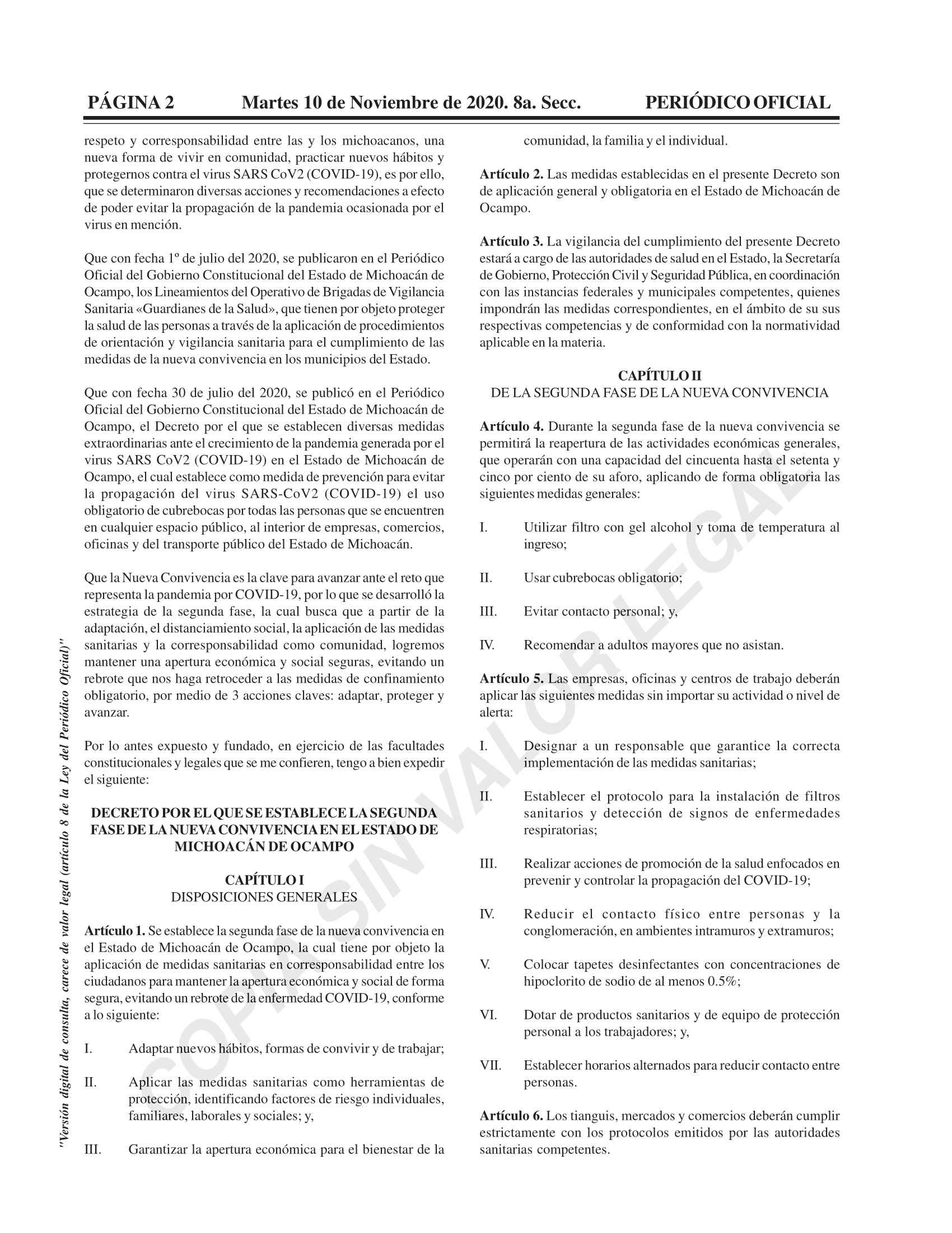 A partir de este miércoles, Michoacán entró a la segunda Fase de la Nueva Convivencia ante la pandemia por el COVID-19, por lo que se permitirá la apertura de establecimientos hasta el 75%, pero se sancionará con multa, clausura y arresto administrativo a quienes incumplan con las disposiciones.