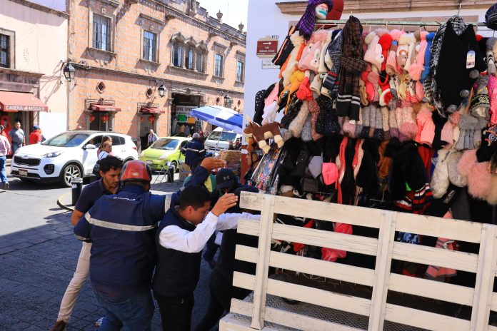 Morelia, Michoacán.- Con el objetivo de ordenar y regular comercio en la vía pública, la Secretaría de Servicios Públicos encabezó un operativo coordinado con Policía de Morelia, DIF Municipal y la Dirección de Mediación y Derechos Humanos para retirar puestos semifijos que carecían de las tolerancias correspondientes.