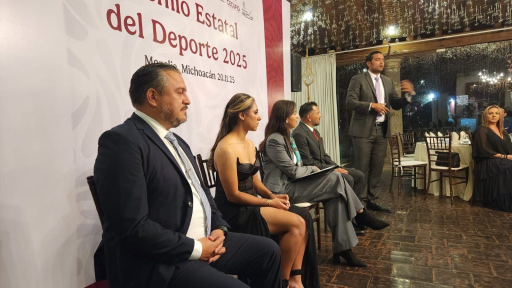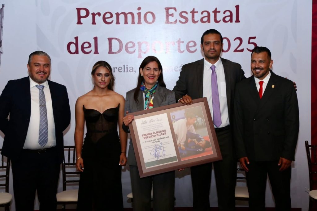 La patinadora Naim Bucio y la Asociación Michoacana de Judo recibieron el Premio Estatal del Deporte 2025 la noche de este jueves; la ceremonia privada se realizó en un hotel del sur de Morelia, encabezada por Gabriela Molina Aguilar, secretaria de Educación de Michoacán; Raúl Morón Vidal, director de CECUFID y Julio Medina, director del Zoológico de Morelia.
