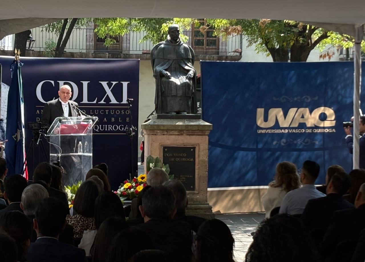 La Universidad Vasco de Quiroga conmemoró el 461 aniversario luctuoso de Vasco de Quiroga, con un llamado del orador oficial, el monseñor Francisco Javier Acero Pérez, a retomar las enseñanzas del llamado Tata Vasco, basadas en el diálogo y el encuentro, para hacer frente a la polarización ideológica que vive la sociedad con los pueblos originarios.