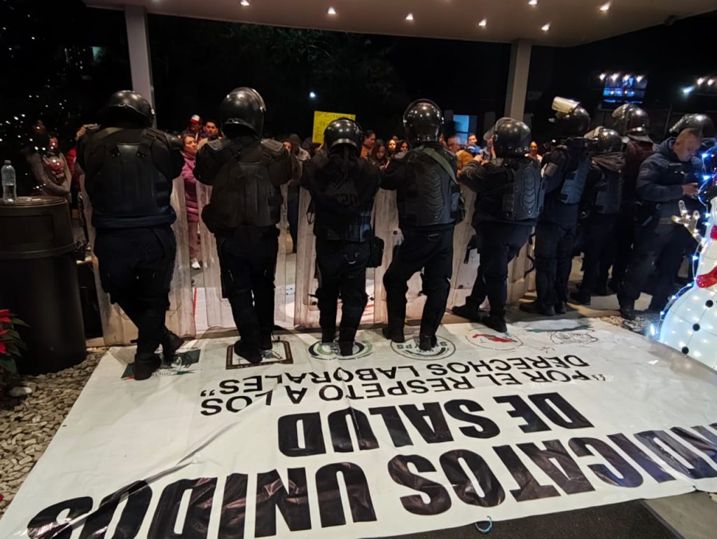 Con pancartas, consignas y hasta una que otra canción de banda, integrantes de sindicatos del sector salud se manifestaron la noche de este domingo y durante las primeras horas de este lunes frente al hotel Festa Inn de Altozano, hasta donde se trasladaron diputados locales para sesionar y aprobar el Paquete Fiscal del gobierno estatal para el 2026.