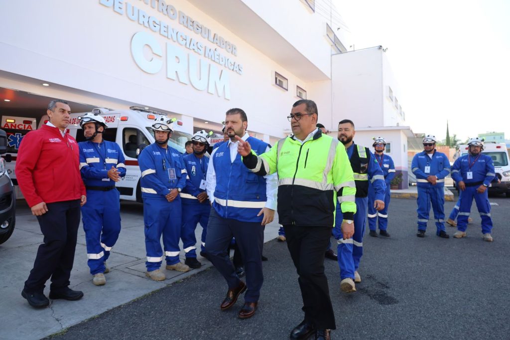 El secretario de Gobierno, Raúl Zepeda Villaseñor, y el secretario de Salud, Elías Ibarra Torres, dieron el banderazo de salida a cuatro ambulancias del Centro Regulador de Urgencias Médicas (CRUM), cinco unidades médicas móviles equipadas con instrumental, medicamento y material de curación y una unidad de logística.