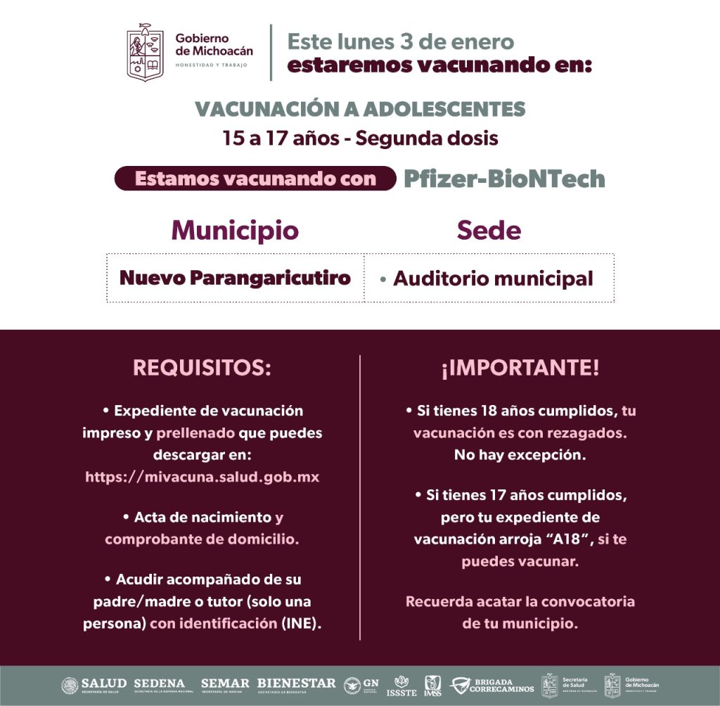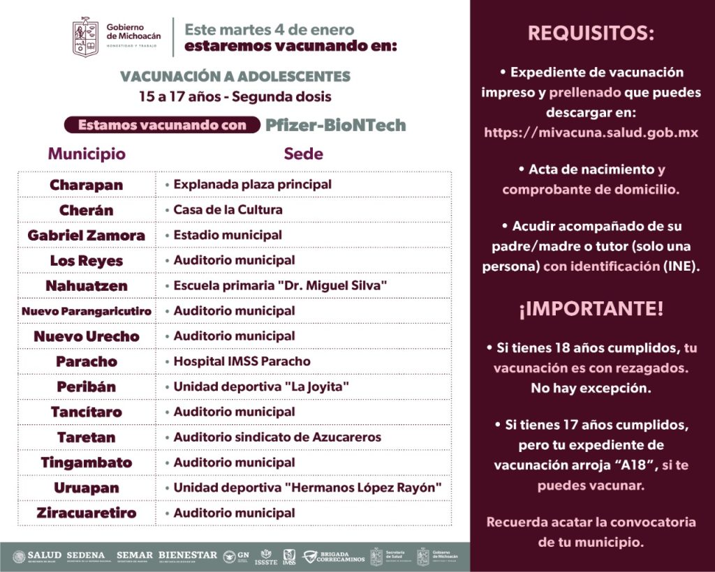 Para el 04 de enero, la segunda dosis de vacunación anticovid para los adolocentes de 15-17 años se realizará en los municipios de: Charapan, Cherán, Gabriel Zamora, Los Reyes, Nahuatzen, Nuevo Parangaricutiro, Nuevo Urecho, Paracho, Peribán, Tancítaro, Taretan, Tingambato, Uruapan y en Ziracuaretiro.