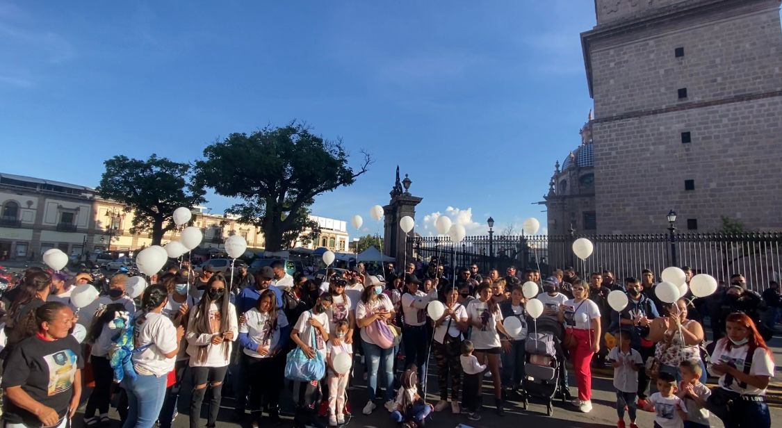 Con globos de color blanco y fotografías de los elementos asesinados, los familiares acompañados por integrantes del Grupo Tigre, salieron a marchar desde la fuente de Las Tarascas hasta Palacio de Gobierno, en donde se concentraron para rendir un homenaje.