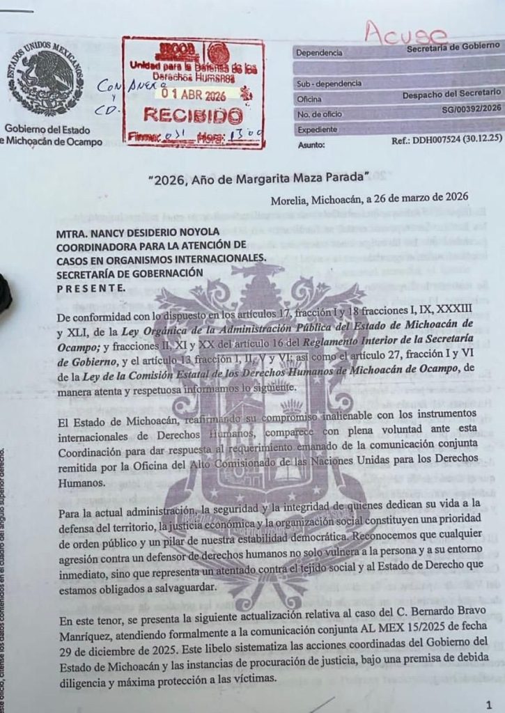 Morelia, Michoacán.- El secretario de Gobierno, Raúl Zepeda Villaseñor, informó que el Gobierno del Estado, en coordinación con la Comisión Estatal de los Derechos Humanos (CEDH), ha mantenido una comunicación puntual con la Organización de las Naciones Unidas (ONU), enviando la documentación correspondiente sobre los avances en la investigación por el homicidio del líder limonero Bernardo Bravo Manríquez desde el pasado 1 de abril.