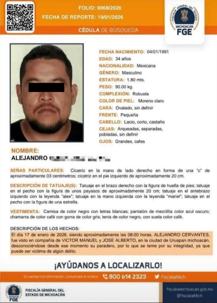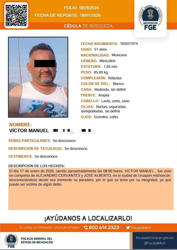 De acuerdo con las fichas de búsqueda emitidas por la Fiscalía de Michoacán estas personas fueron vistas por última vez el pasado 17 de enero en el mirador del Lago de Pátzcuaro; viajaban en un vehículo Nissan, Tsuru, color blanco y luego de que familiares perdieron comunicación con ellos decidieron denunciar los hechos y a través de las redes sociales difundieron sus fotografías y solicitaron el apoyo de la ciudadanía para localizarlos.