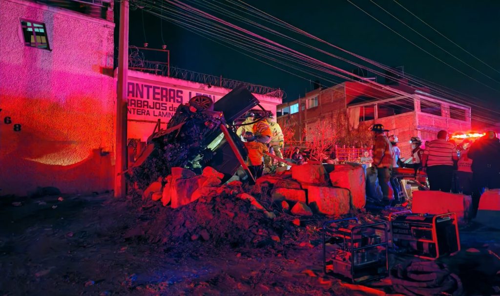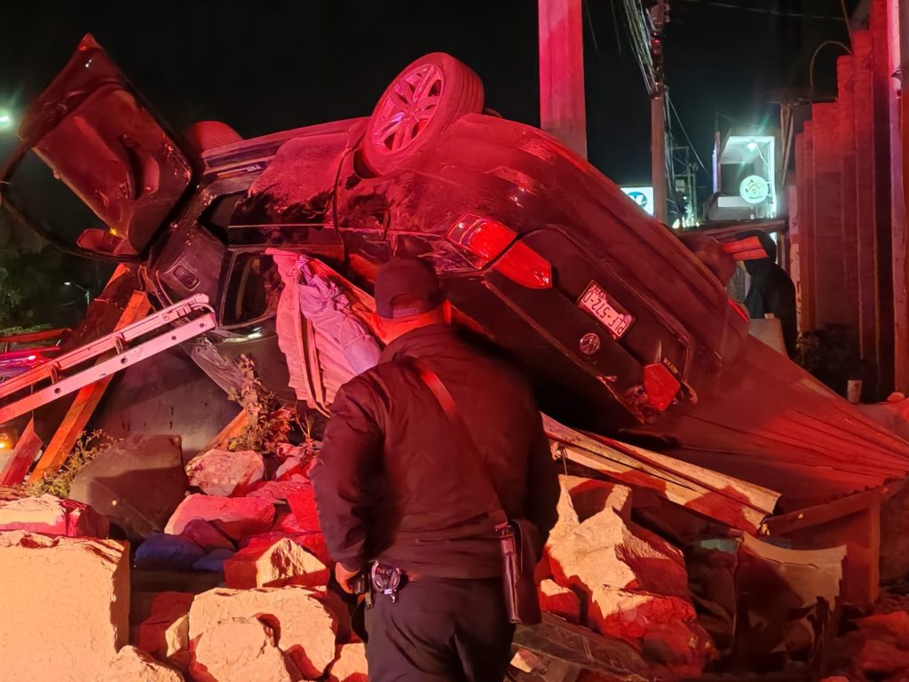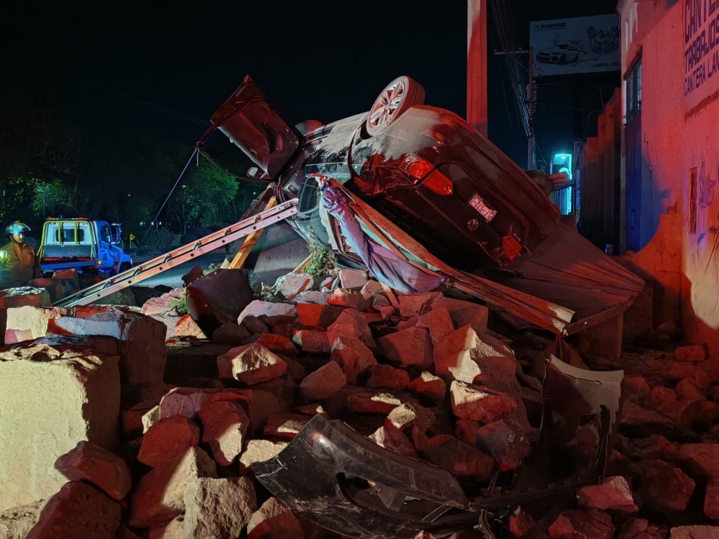 El vehículo involucrado es un Volkswagen Jetta, con placas PLF572D, el cual terminó destrozado y sobre unos bloques de cantera ubicados afuera del negocio denominado “Canteras León”.