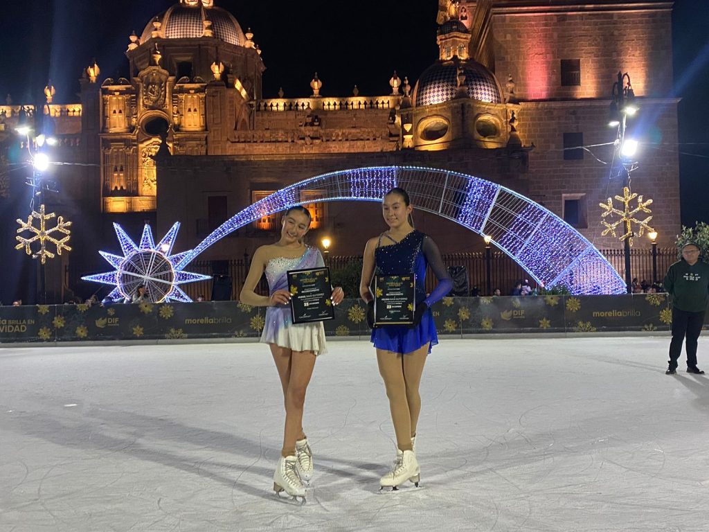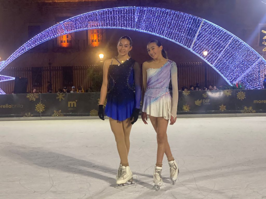 Las hermanas Nava Gutiérrez iluminaron la pista de hielo en el centro de Morelia