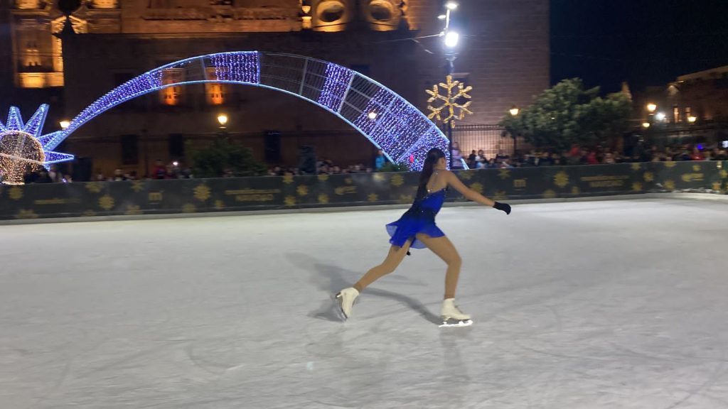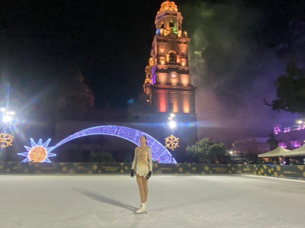 Las hermanas Helena y Muriel Nava Gutiérrez iluminaron la pista de hielo en el centro histórico de la capital michoacana la noche de este sábado, demostrando su gran talento y que las ha llevado a competencias internacionales.