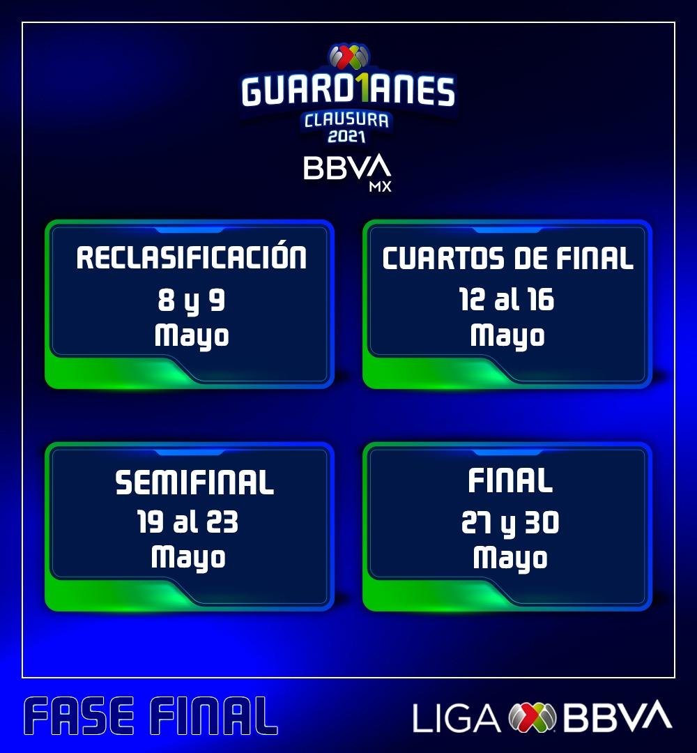 La fase final del Guardianes 2020, comenzará con la reclasificación que se jugará el 8 y 9 de mayo, seguida de los cuartos de final que se disputarán del 12 al 16 de mayo, mientras tanto las semifinales se van a jugar del 19 al 23 de mayo y la gran final se jugarán del 27 al 30 de mayo.
