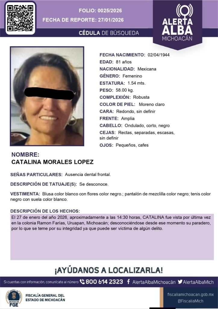Uruapan, Mich.- Una mujer adulta mayor fue localizada sin vida, al interior de una barranca del cerro de la Cruz, al norte de la ciudad de Uruapan. La fallecida estaba reportada como desaparecida y contaba con Alerta Alba.