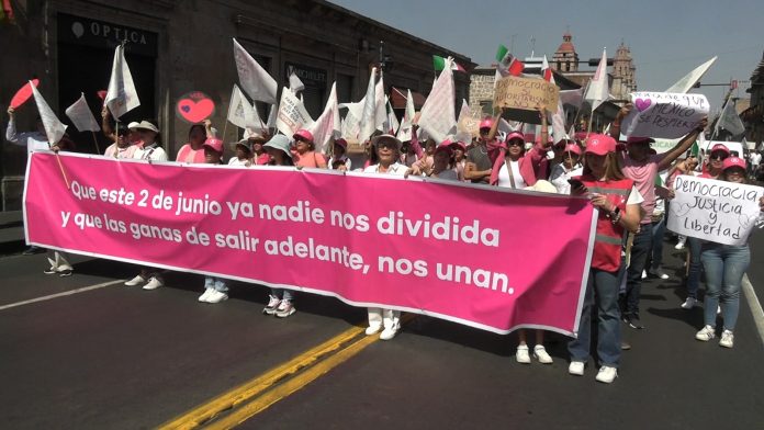 Entre consignas de rechazo a Morena y a la dictadura, los participantes acudieron vestidos de blanco y rosa en su mayoría, con pancartas y lonas en rechazo al gobierno federal.