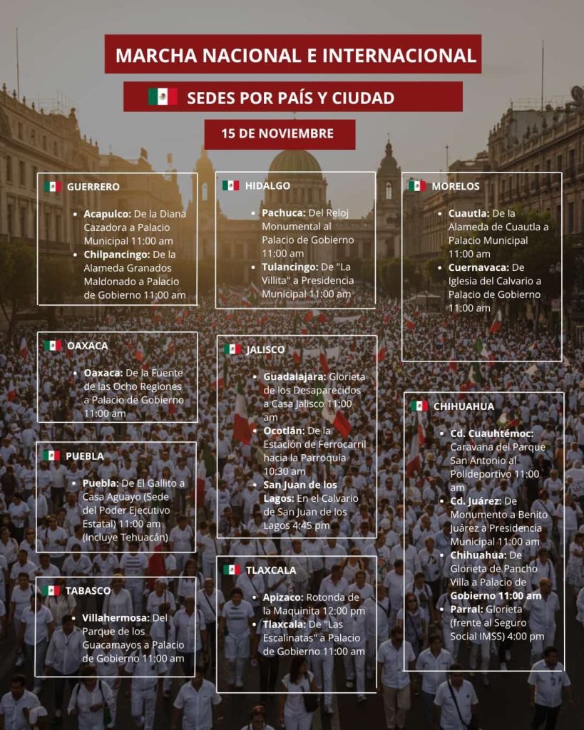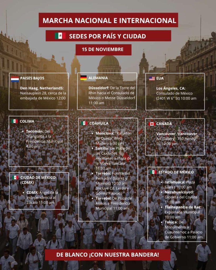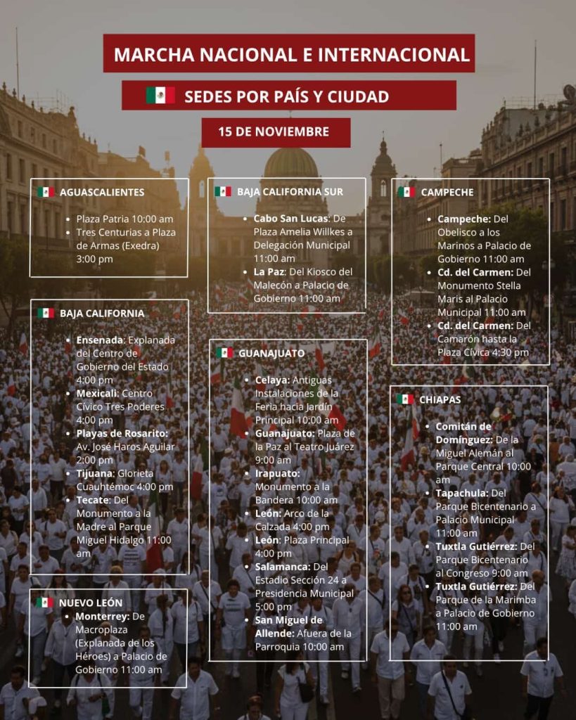 Más de 90 ciudades de México, Estados Unidos de Norteamérica, Canadá y Países Bajos se sumarán este 15 de noviembre a la Movilización convocada por la denominada Generación “Z”, en demanda principalmente de que se implemente un mecanismo ciudadano efectivo de Revocación de Mandato.