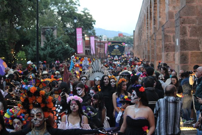 En medio de una gran multitud, la caminata de los esqueletos finalizó en las inmediatas de la Catedral de Morelia.