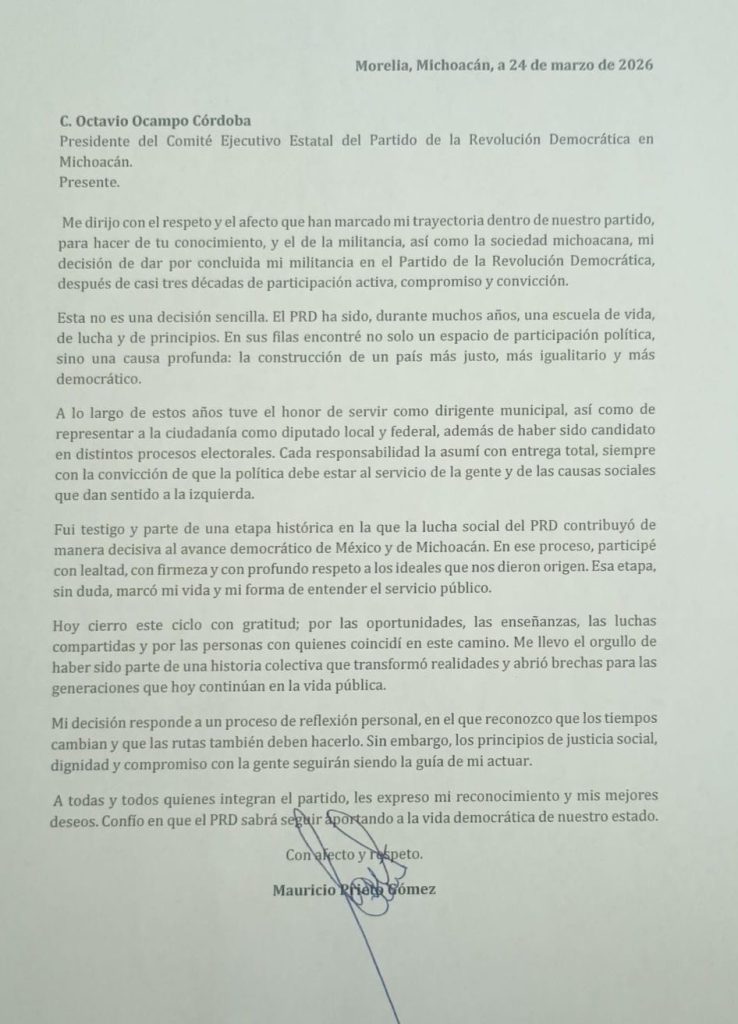 A través de una carta dirigida al dirigente estatal del PRD, Octavio Ocampo Córdova, informó que da por concluida su etapa dentro del partido, en el que aseguró encontró no solo un espacio político, sino una causa ligada a la construcción de un país más justo.
