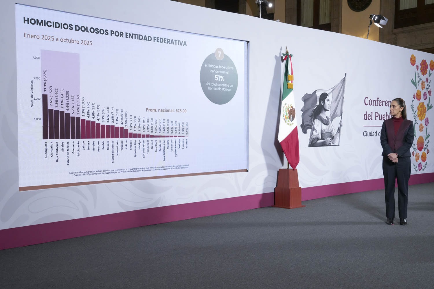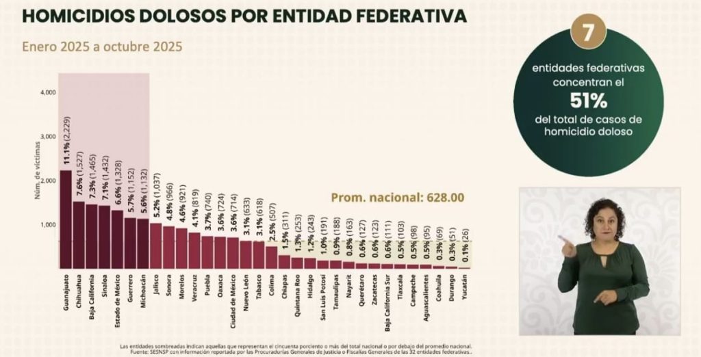 Con un total de 1 mil 132 homicidios dolosos registrados entre enero y octubre del 2025, Michoacán es el séptimo estado del país con mayor incidencia de este delito, y junto con otros 6 estados acumula el 51% de los 18 mil 792 asesinatos que se cometieron en el país durante los primeros 10 meses del año .
