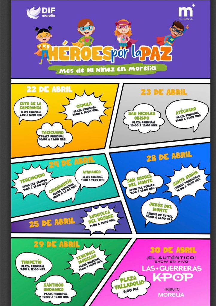 Del 22 al 30 de abril, el Ayuntamiento de Morelia organizará 16 festejos en las tenencias, la Ludoteca del Bosque y un evento de cierre con el show de “Las Guerreras K-pop” en la plaza San Francisco, con el objetivo de llevar alegría a niñas y niños tanto de la zona rural como urbana del municipio.