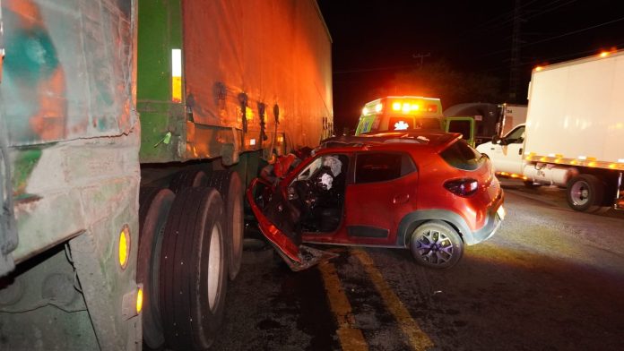 El tractocamión involucrado corresponde a un Freightliner de color blanco, unidad que junto con el auto fueron asegurados por agentes de seguridad vial mientras se determinan responsabilidades.