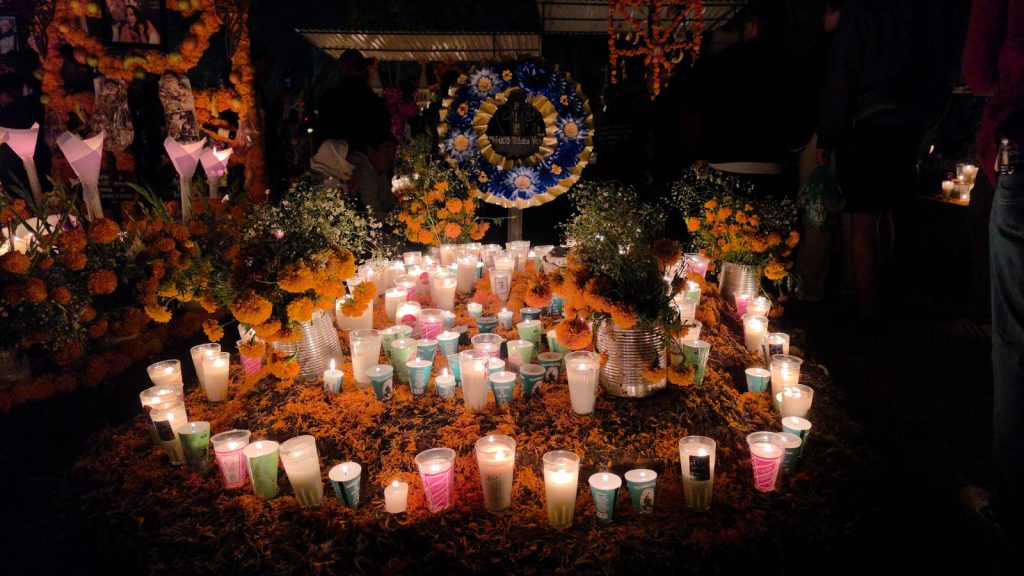 El aire huele a copal, a tierra húmeda y a comida recién hecha. En los altares, el color se vuelve lenguaje, las flores naranjas y amarillas del cempasúchil se mezclan con el morado del papel picado y el blanco de las velas que forman caminos luminosos hacia las tumbas, y los vivos entonces conversan con sus muertos en un silencio sagrado.