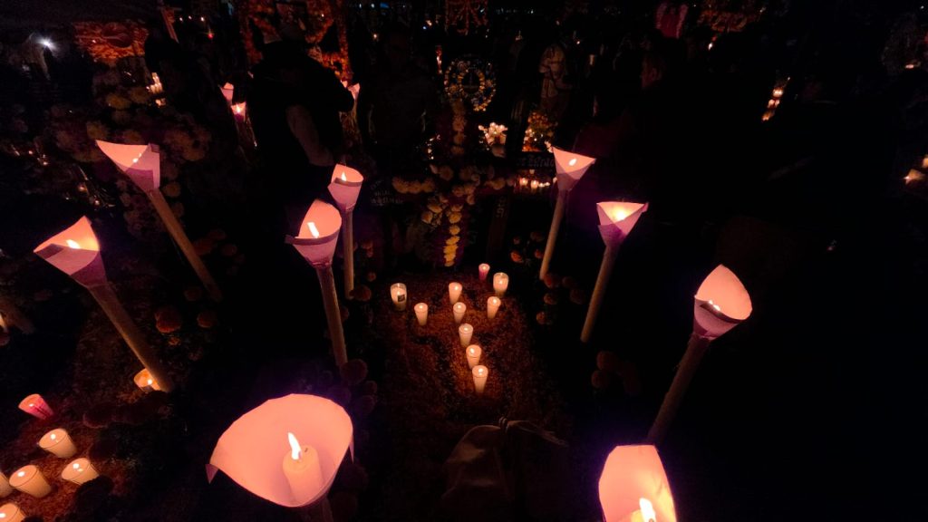Mientras tanto, las aguas del Lago de Pátzcuaro reflejan miles de luces que titilan como estrellas caídas. La isla de Janitzio resplandece desde lejos, su panteón lleno de flores, las familias velando entre murmullos y guitarras, los niños jugando entre velas sin entender del todo el milagro que presencian. El sonido de los remos de las lanchas se mezcla con los cantos, mientras los visitantes cruzan las aguas para presenciar uno de los rituales más conmovedores de México.