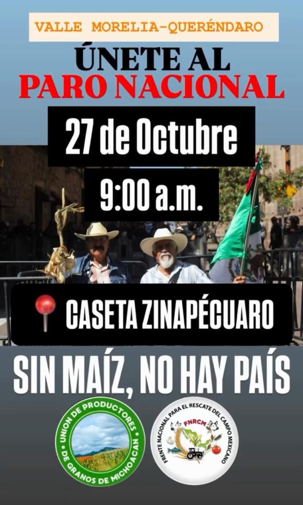 Productores de granos de Michoacán, Guanajuato y Jalisco realizarán este lunes una nueva jornada de movilizaciones, como manera de presión a las autoridades federales y estatales, ante la falta de respuesta a sus exigencias, en especial a que se otorgue un precio de garantía de 7 mil 200 pesos por tonelada de maíz.