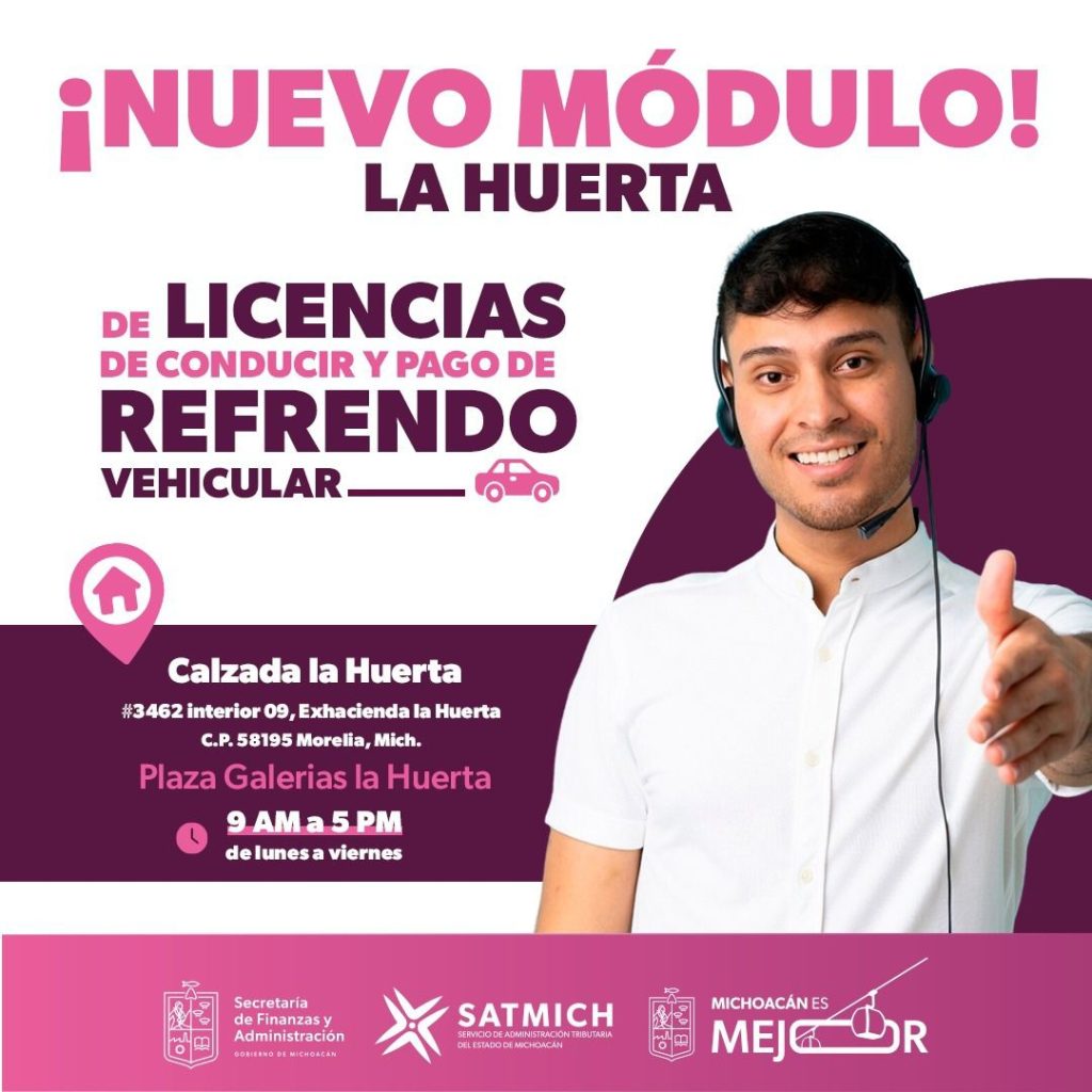Finalmente, dio a conocer que la oficina de Recaudación, con horario de 9:00 a 17:00 horas, de lunes a viernes, se encuentra en Plaza Las Galerías La Huerta, la cual se localiza en calzada La Huerta 3462, interior 9, Exhacienda La Huerta, en la ciudad de Morelia.