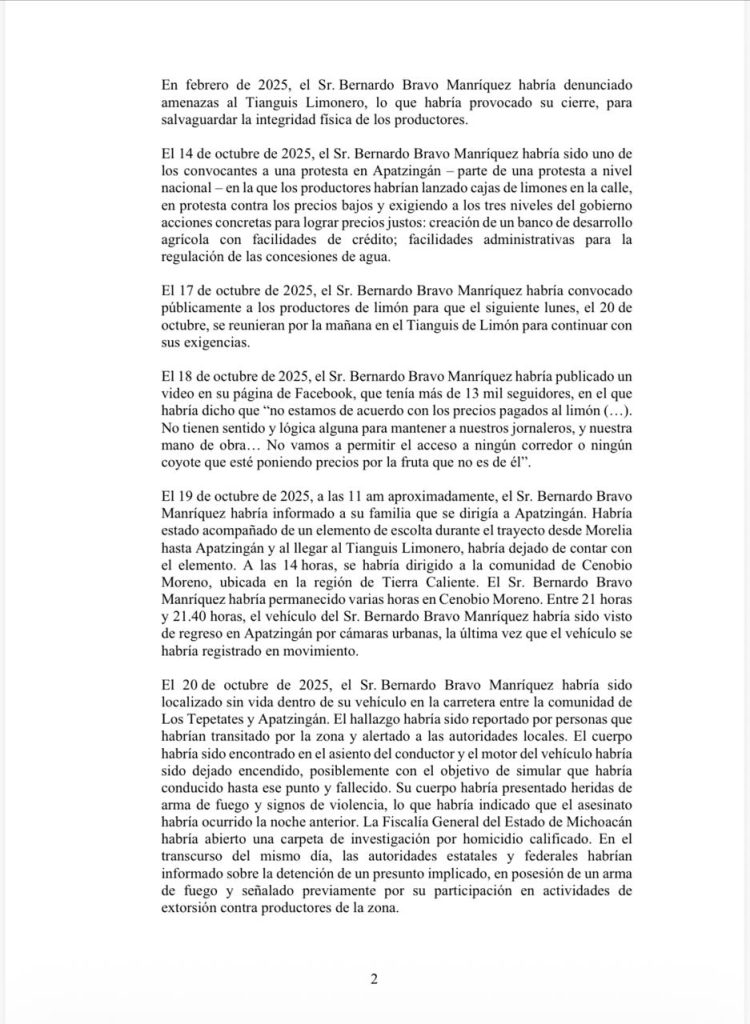 De acuerdo con la información recibida por los relatores, Bravo Manríquez fue presidente de la Asociación de Citricultores del Valle de Apatzingán y denunció públicamente prácticas de extorsión, control de precios y cobro de cuotas a productores agrícolas por parte de redes criminales que operan en la región.