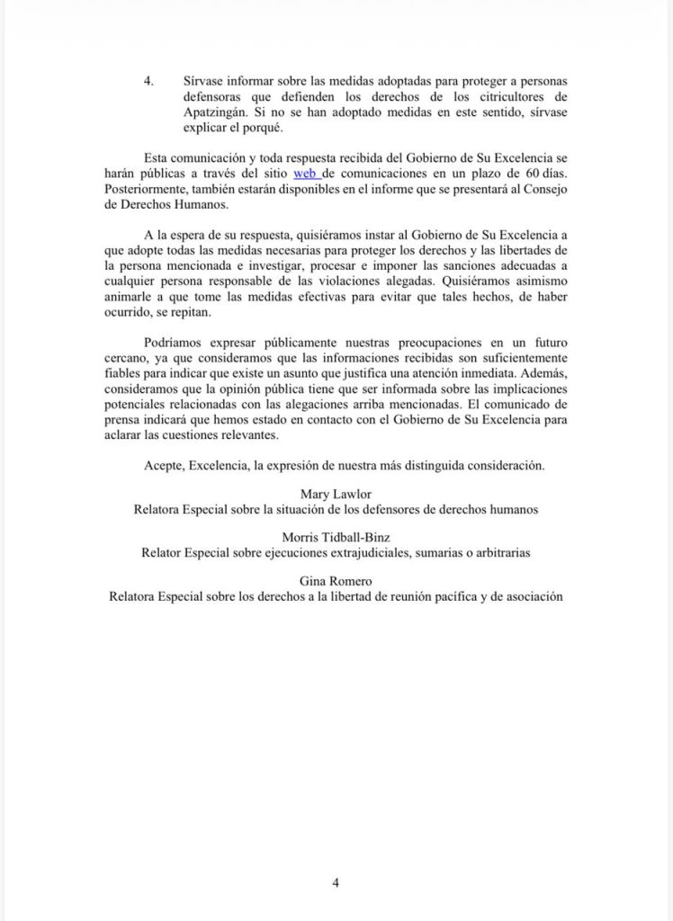 En el documento, los expertos señalaron que el caso debe investigarse tomando en cuenta su labor como defensor de derechos humanos. “Expresamos nuestra profunda preocupación por el asesinato del defensor de los derechos humanos, el Sr. Bernardo Bravo Manríquez, que tememos esté directamente vinculado con su labor legítima en defensa de los derechos humanos de los productores de limones de Apatzingán”, indica la comunicación.