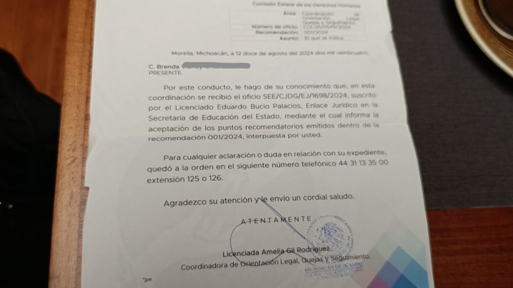 Morelia, Mich.– Brenda Ortiz, madre de un menor víctima de violencia escolar, acusó a la Secretaría de Educación del estado (SEE) de actuar con insensibilidad y falta de compromiso para cumplir con la reparación del daño ordenada por la Comisión Estatal de Derechos Humanos (CEDH), luego del fallo emitido a su favor.