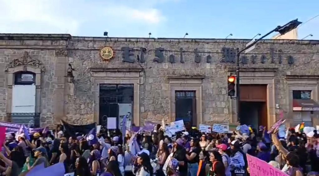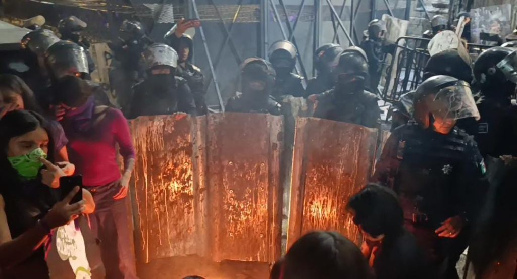 En el caso de Palacio de Gobierno, las manifestantes rompieron cristales y cubrieron la fachada principal con pintura negra y roja, además de pegar las pancartas que portaron a lo largo de la jornada; lograron quitaron las vallas metálicas que cubrían la puerta principal y lanzaron botellas con agua, así como proyectiles a las policías.